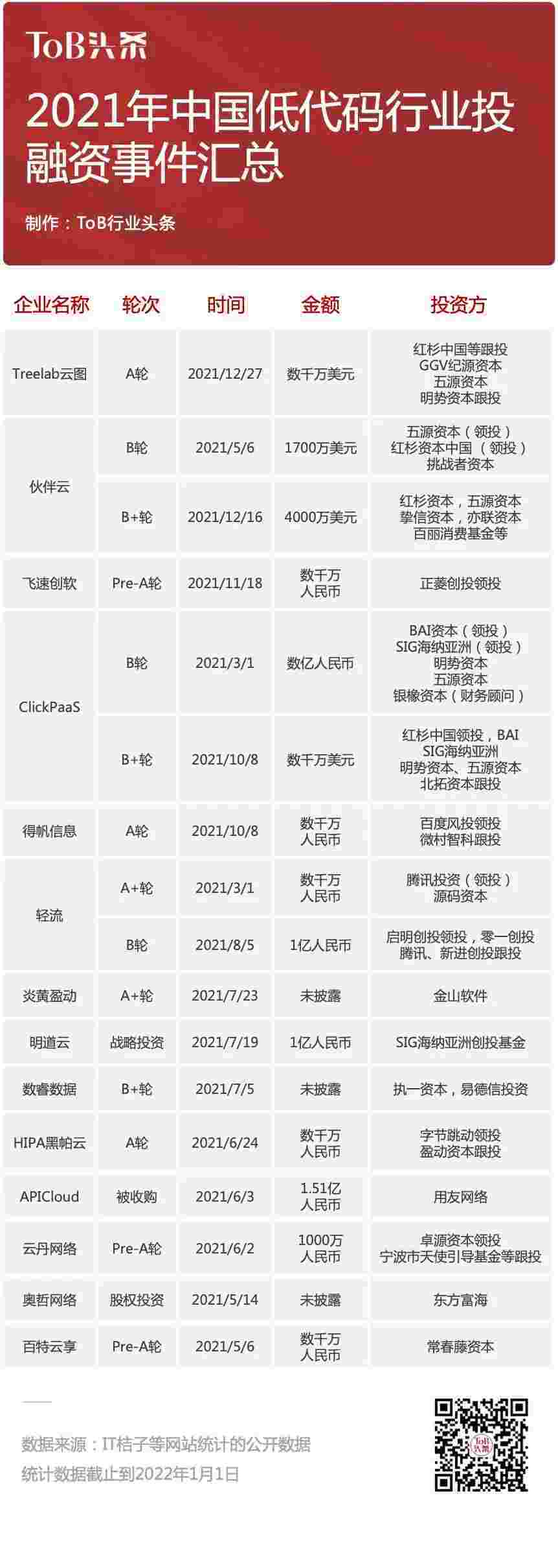 到2021年,,,无/低代码投融资规模势头更甚,,其中包括轻流两轮融资(A+轮数千万人民币,,,B轮近亿人民币)、、、CGPAY钱包 两轮融资(B轮数亿人民币,,B+轮数千万美元)、、、、百特云享数千万元Pre-A轮融资......